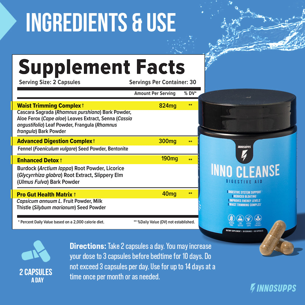 Inno Cleanse™ helps flush out toxins that accumulate in your gut and intestines. You WILL FEEL this natural formula work within 24-48 hours and can expect to eliminate waste, trim down your waist size and look and feel better OR we will give you 100% of your money back.*