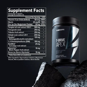 What is T-Drive™ Apex, and how does it work?T-Drive™ Apex is an advanced testosterone support supplement designed to boost natural testosterone levels, improve energy, boost muscle strength and promote overall vitality. It combines clinically studied ingredients like Longjack root extract, Shilajit resin extract, and Shoden® Ashwagandha to supercharge testosterone production, optimize hormone balance, reduce stress and improve physical performance.*