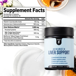Advanced Liver Support supports liver health through its synergistic blend of key ingredients that work together to promote optimal liver function. N-acetyl Cysteine (NAC) can help boost the liver's filtering capacity, aiding in the removal of unwanted debris and supporting peak functionality. Milk Thistle Extract enhances the liver's ability to filter and cleanse the body effectively, shielding it from harmful debris and promoting a healthy inflammatory response. Selenium supports the liver's defense against oxidative stress by being part of antioxidant enzymes that help protect the liver cells from damage caused by free radicals.*