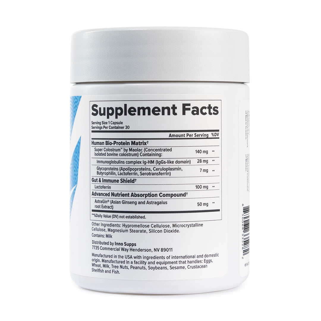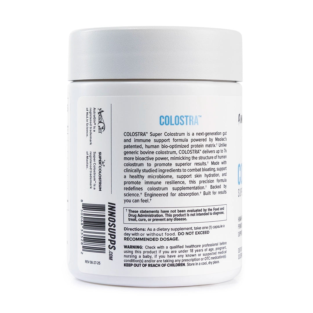 COLOSTRA™ is made with Super Colostrum™, which is 7x more bioactive than regular bovine powder colostrums. Unlike powder colostrum meant for baby cows, COLOSTRA™ is human-optimized, odorless, tasteless, and delivered in capsule form for superior convenience and bioavailability. It features human-optimized Ig-HM antibodies instead of cow-targeted IgG and includes AstraGin® to enhance absorption.