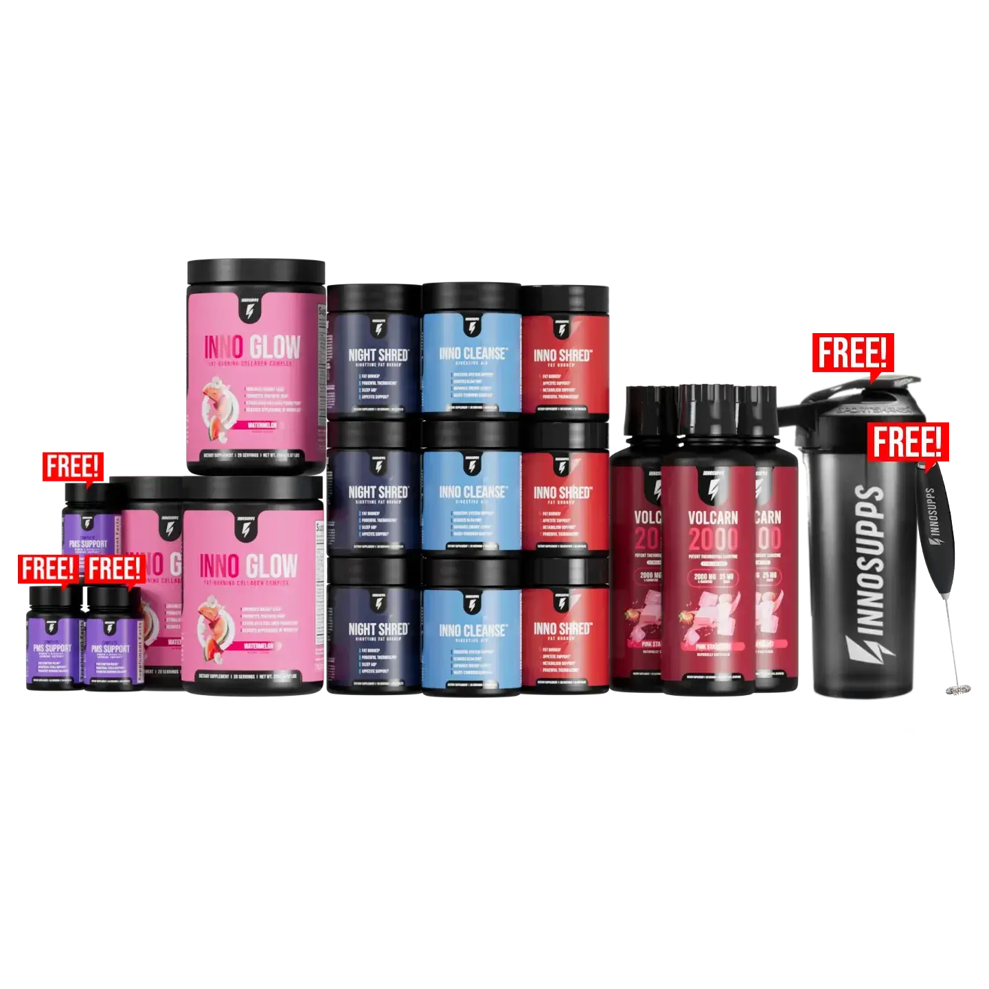 3 Free Bottles of Complete PMS Support 1 Free Inno Supps Shaker Bottle 1 Free Inno Supps Frother Burn Fat While Supporting Skin Texture* Beat Bloating and Flush Out Waste* Boost Metabolism 24/7*