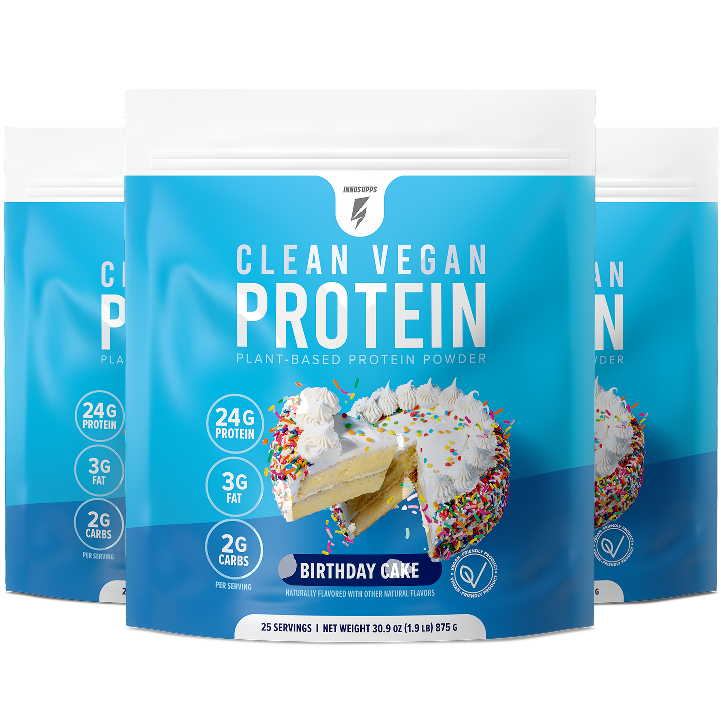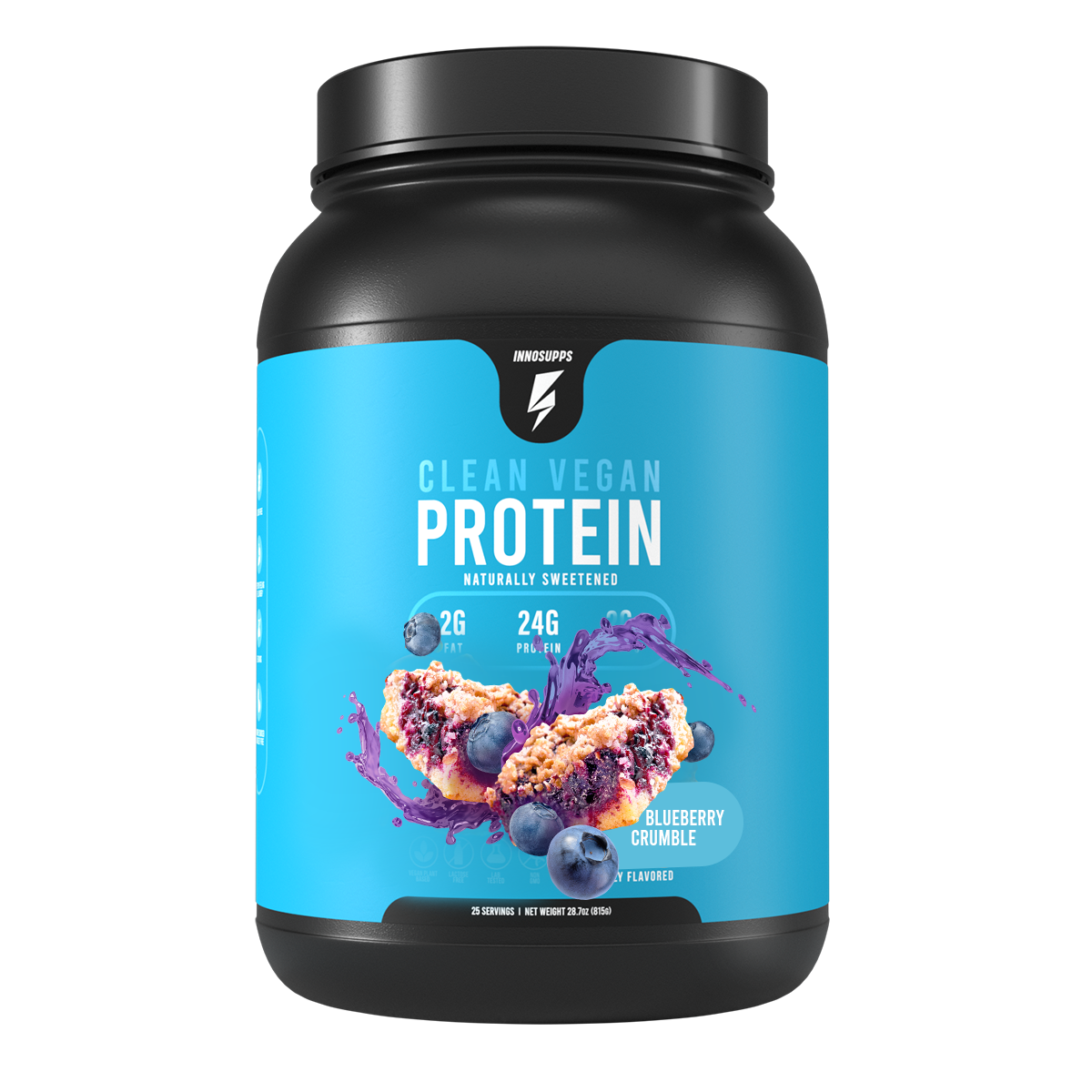 There are 25 servings in each tub of Clean Vegan Protein, and each serving contains 24 grams of protein.*