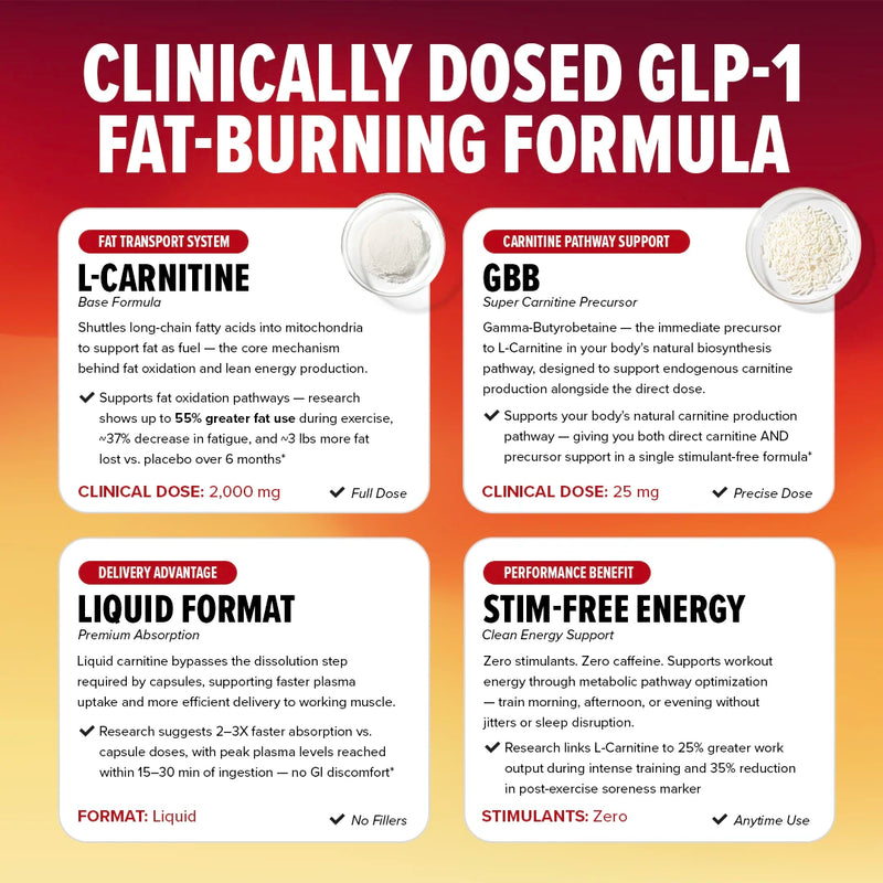 - L-Carnitine (2000mg): The "Fat Transport System" that shuttles fatty acids into mitochondria, boosting fat burn 5.3x and preserving lean muscle.