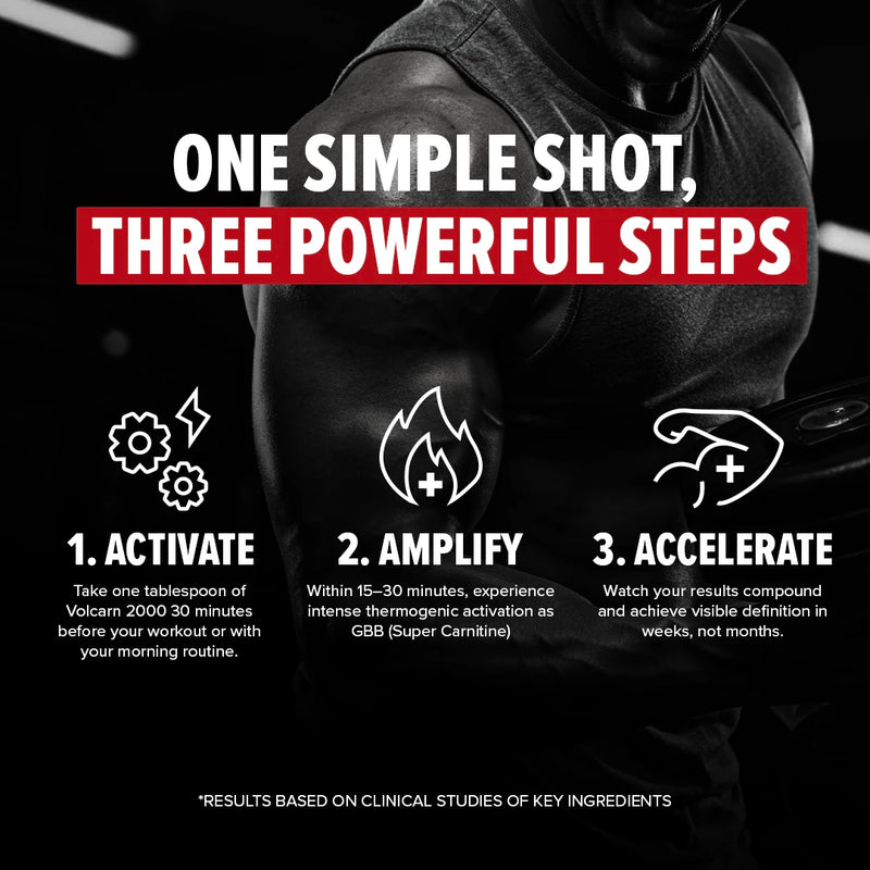 Volcarn™ 2000 uses a high-dose liquid delivery system to act as a metabolic shuttle. While standard fat burners just rely on stimulants, Volcarn™ 2000 provides 2000mg of L-Carnitine to transport fatty acids directly into your mitochondria to be burned for fuel. We’ve added GBEEC (Super Carnitine), which raises your body's carnitine utilization by 300%, effectively turning your body into a "fat-burning sauna".